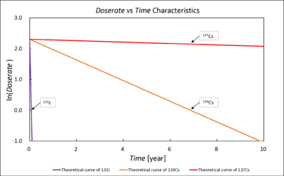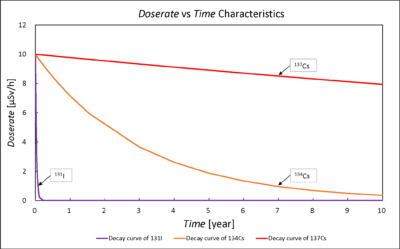 Radioactivity of radioisotopes (Iodine-131, Cesium-134, Cesium-137) decays exponentially with time.