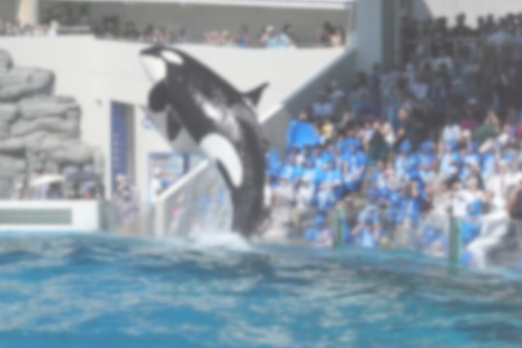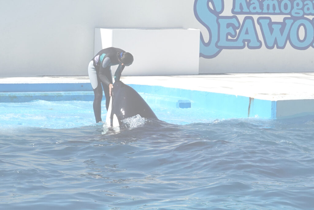シャチは女性トレーナーと良くコミュニケーションが出来ているように見えます。この後、シャチはトレーナーを背中に乗せて安定して泳いだり、立ち泳ぎをしてトレーナーを口先に立たせて安定して泳いだりしました。(写真公開不可)