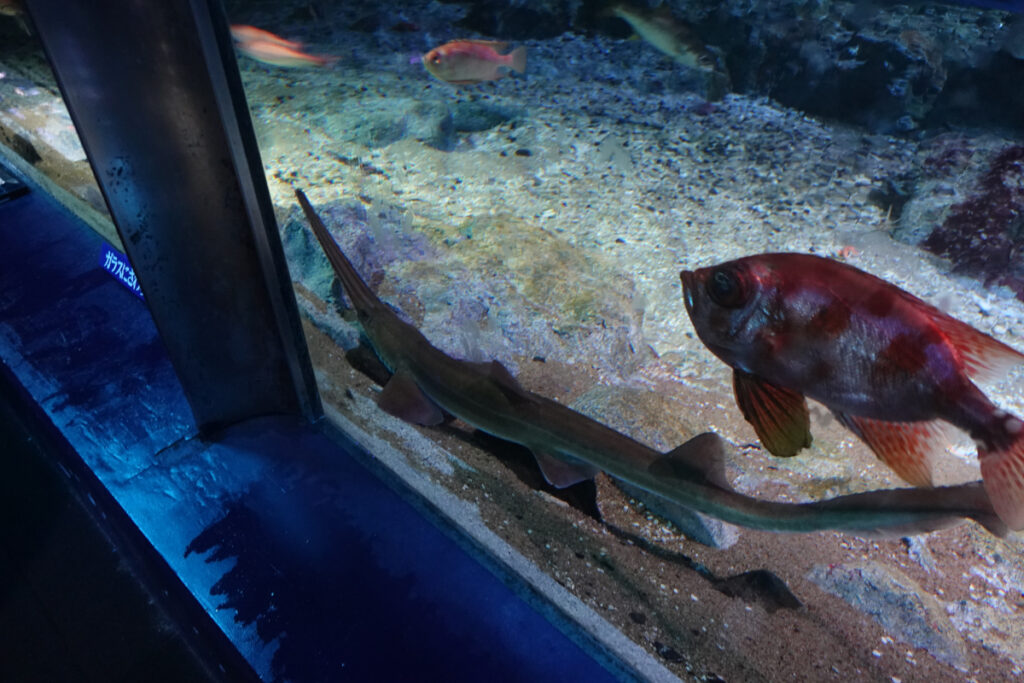 鴨川沖には、1,000m以上の深さまで急な斜面が続く「鴨川海底谷」があり、薄暗い海底にはキンメダイやノコギリザメなどの深海性の魚が暮らしています。