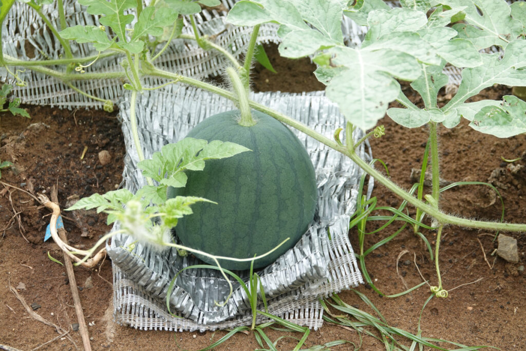 I harvested four large watermelons and cut off the main vine. The remaining secondary vines continued to grow and produced female flowers, so I artificially pollinated them on August 5th. I thought they wouldn’t grow any more, but they’re getting bigger. On August 21st, they’ve grown even bigger. I was surprised.