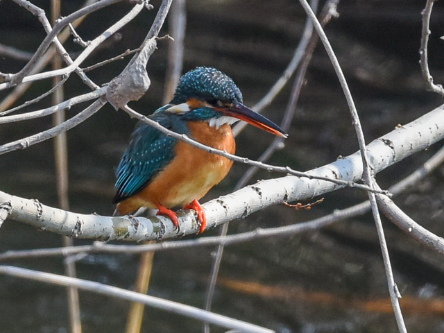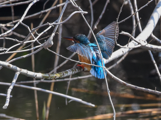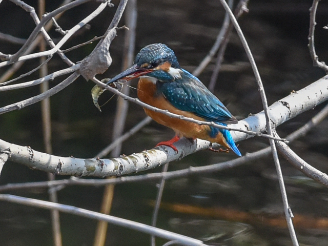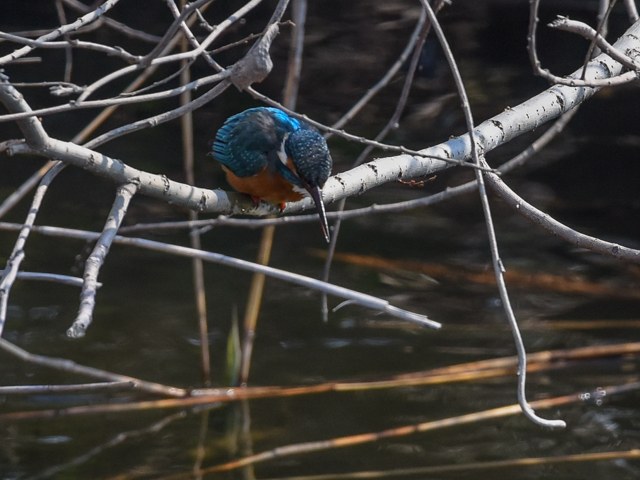 エビを捕ったこのカワセミはメスだ。オスとメスが交代で卵の面倒みているのかな? 5月には雛を見たいな。カワセミの前面に細い木の枝があるが、焦点はカワセミに合っている。カワセミはエビをそのまま?み込んだ。