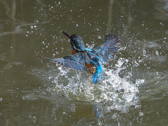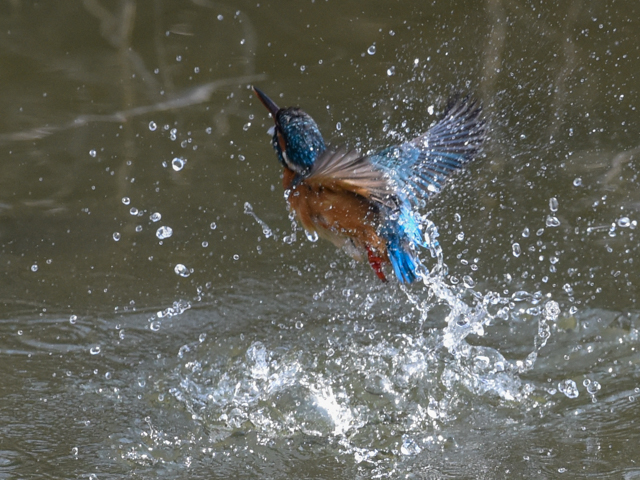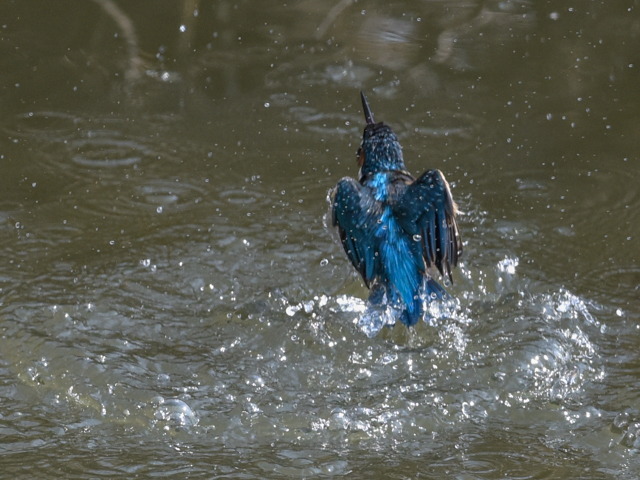 撮影は難しいが、カメラの焦点は水面から飛び出すカワセミにかなり良く合っている。