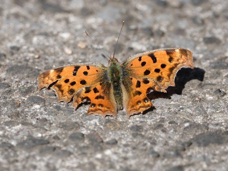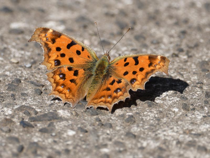 温かいコンクリートの上で休む冬のキタテハ, The Asian comma resting on the warm concrete in winter