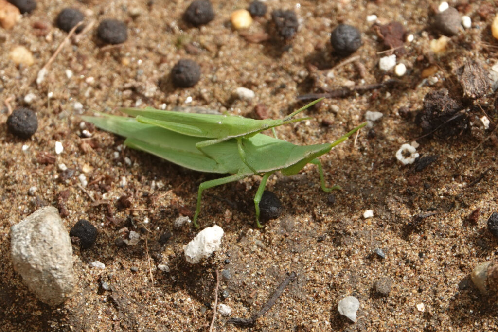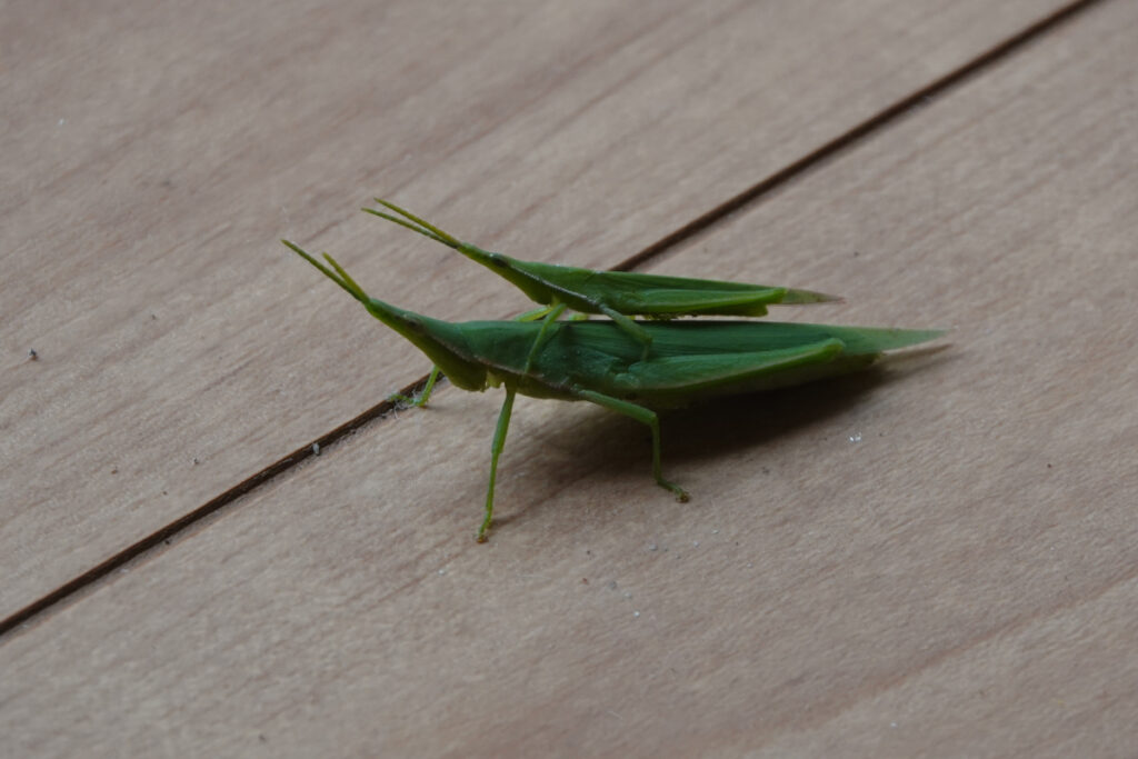 On September 20th, 2025, when I harvested vegetables from my home garden, I found a pair of grasshoppers (Atractomorpha lata) on them. The vegetables were grown without pesticides, so they must be tasty. I let the grasshopper out into the garden. Even if I throw them in the garden, the small male won’t leave the back of the larger female!