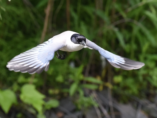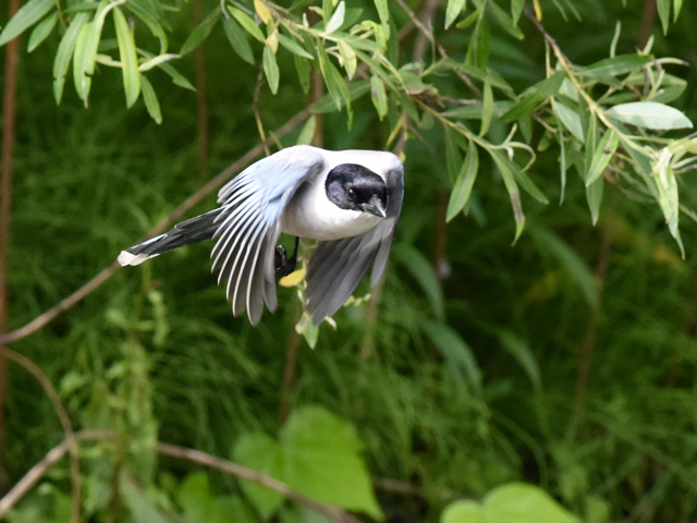 オナガが飛んでこちらに向かって来た。黒い顔の表情が見える。飛ぶオナガを前方から見下ろす珍しい写真を撮れた。