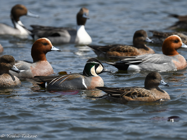 On March 22, 2020, I went to Minuma Natural Park in Saitama City. Yoshino cherry trees were blooming and there were many families. Many Eurasian wigeons were staying in the pond. Only one Baikal teal was accidentally mixed with them.