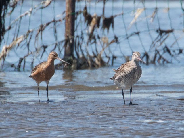 The Bar-tailed godwit (left photo: female) seems to look for bait in a deeper place because it is bigger than other sandpipers and has log feet. This (right photo) sandpiper seems to be a male of the Bar-tailed godwit.