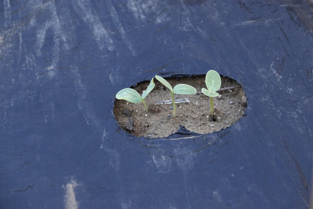 スイカの種を2025年4月29日に撒いてマルチシートをかけていた。