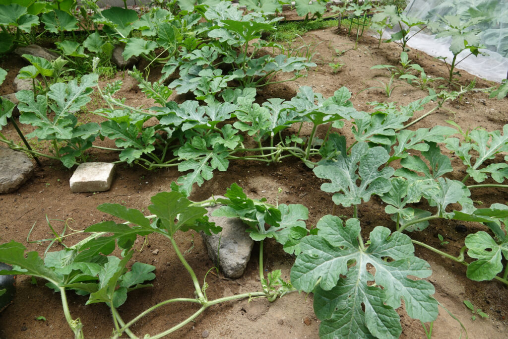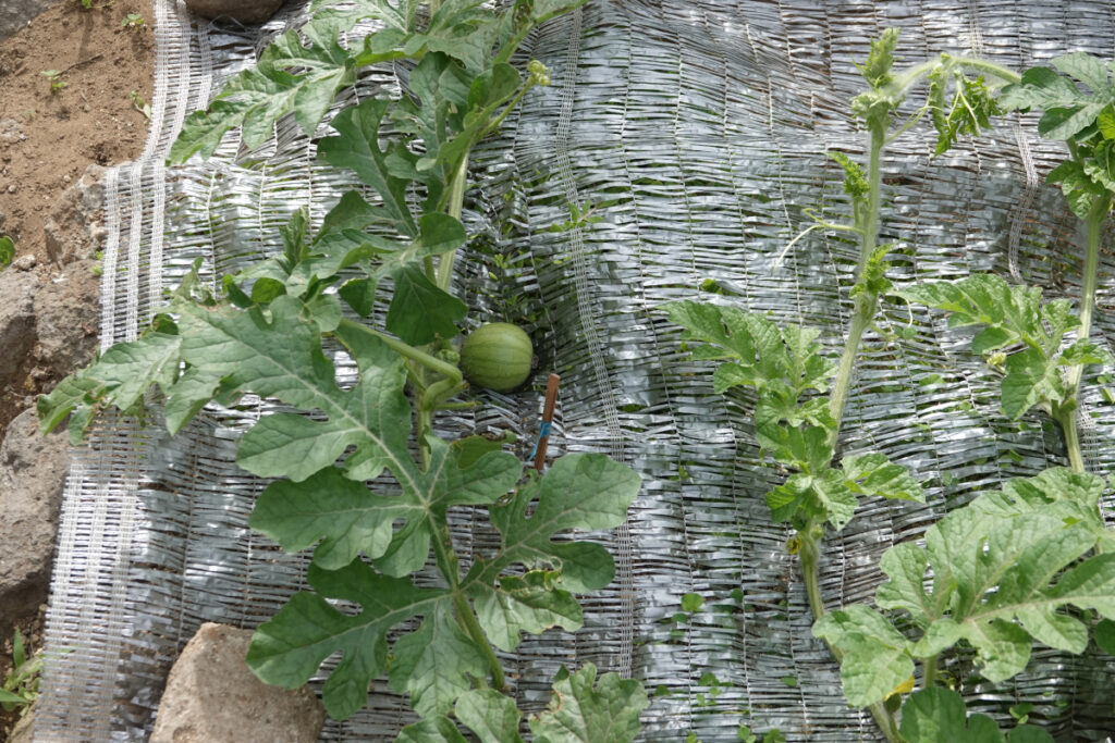 2025年6月12日、スイカの苗木2本が長いつるを伸ばし始めた。
