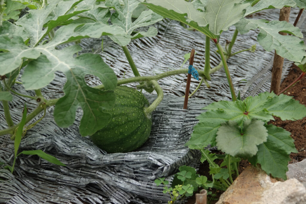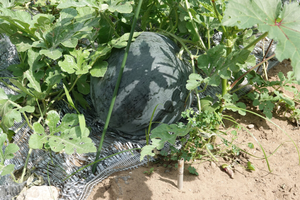 2025年6月23日、左の写真は、6月20日に人工授粉したスイカNo.2の結実した小さいスイカです。