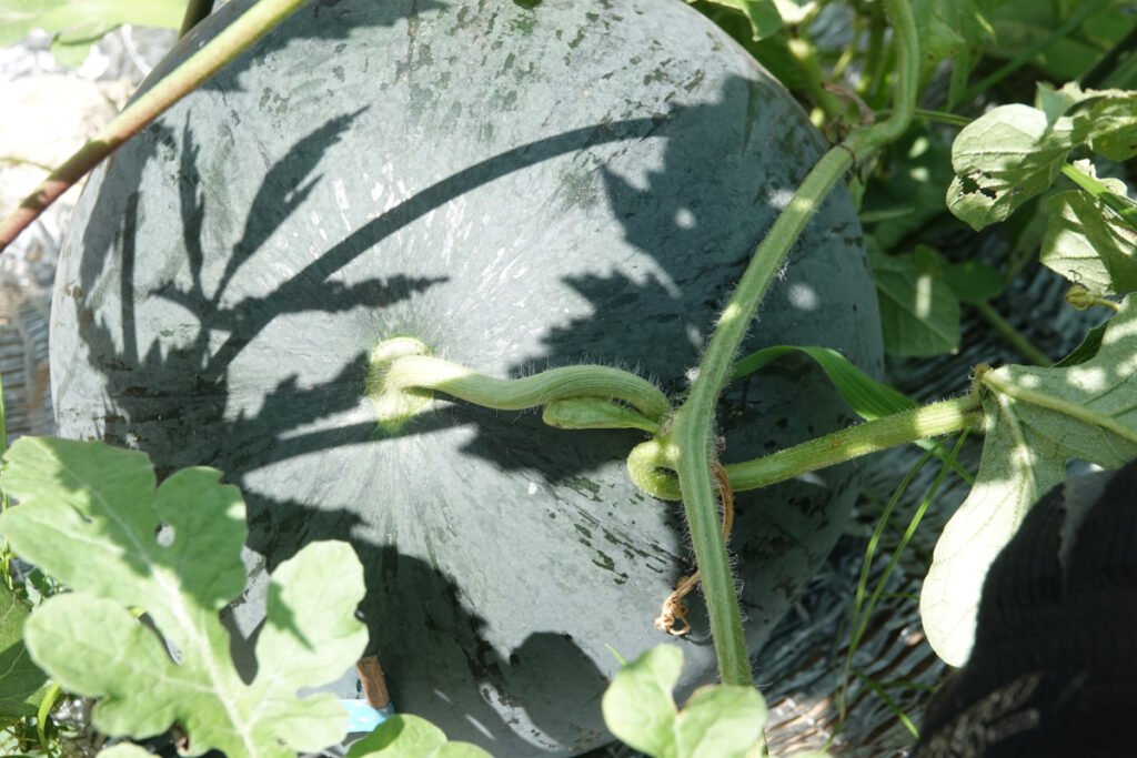 2025年7月21日、スイカNo.2の子づるについた実が付いている節から出ている巻きひげの状態を見ると、全体がしおれているように見える。収穫時期になっているらしい。割れる前に収穫しよう。直径30cm位もある。