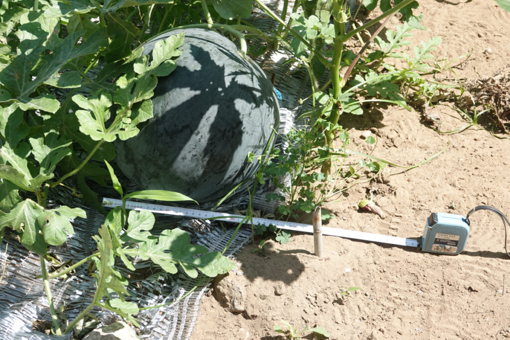 2025年6月23日、左の写真は、6月19日に人工授粉したスイカNo.2の結実した小さいスイカです。