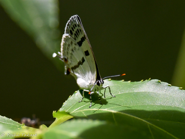 こんぶくろ池自然博物公園の林の中で、木の葉に止まって休んでいる小さいミズイロオナガシジミを見かけた。
