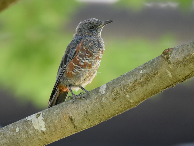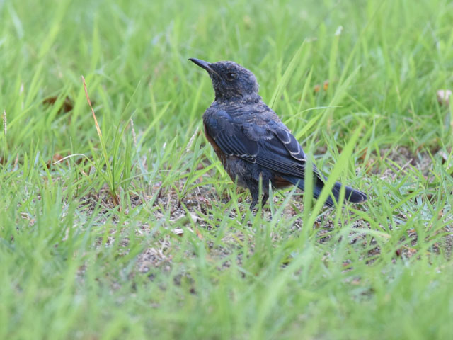 It is said that the blue rock thrush lives mainly around the shore but recently lives the urban area and is seen in the residential area. It seems to prey on insects and small animals at the grass. When I was looking at it, it flew on the rope of the fence in front of me. This bird looks like a young bird yet, and there is not the male characteristic that the head is dark blue.