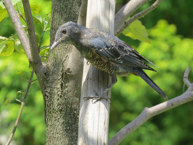 2016年8月14日、孫一家を見送りに行って帰った時、アパートの中庭に黒っぽい小鳥がいた。この鳥はツグミ科のイソヒヨドリのようだ。 この鳥はアフリカとユーラシア大陸に広く分布すると言う。