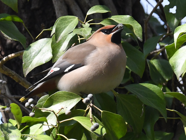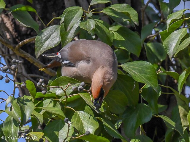 キレンジャクは熟したキヅタの果実を食べていた, The Bohemian waxwing was eating ripe fruits of the Japanese ivy.