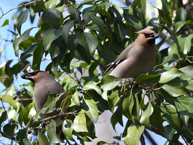 In the forest, an evergreen Japanese ivy climbing other trees that have dropped leaves stands out. This climbing plant has fruits, ripens in black, having round shape, in spring, which offers food for waxwings. This waxwing is the Bohemian waxwing since the tail ends in a bright yellow band. Because the Japanese ivy has plenty of fruits, it seems that several waxwings were eating ripe fruit while flying around. These two waxwings were also the Bohemian waxwings.