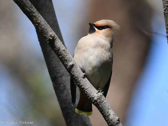 2020年3月25日、秋ヶ瀬公園の近くで会ったバーダーさんが教えてくれた「いまピクニックの森でキレンジャクの写真を撮って来たところだ、 今行けば写真撮れるよ」。森に行くと、野鳥写真撮影グループの姿が見られた。トリビトのターゲットはレンジャクだ。 キレンジャクが比較的近い木の枝に止まっていた。