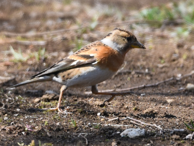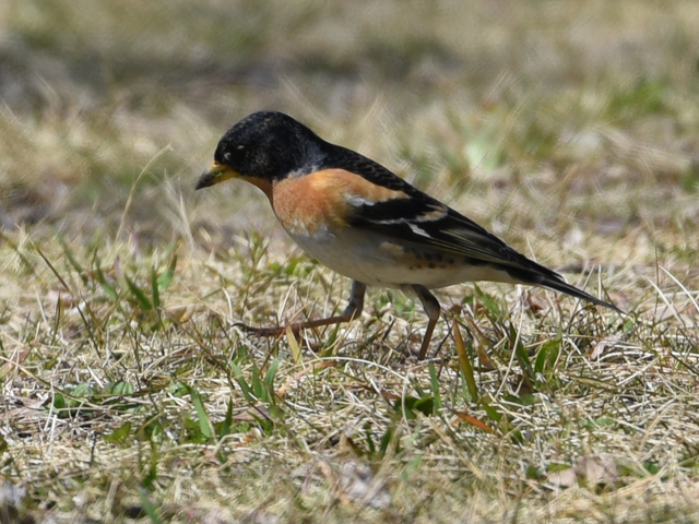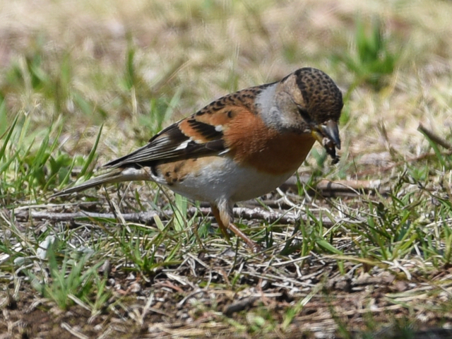 On April 4, 2017, I strolled in Kashiwanoha Park. A small group (5 – 6) of male and female Brambling was feeding in the local forest grass field of the park. This brambling with brown head will be a female.