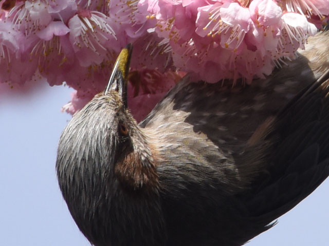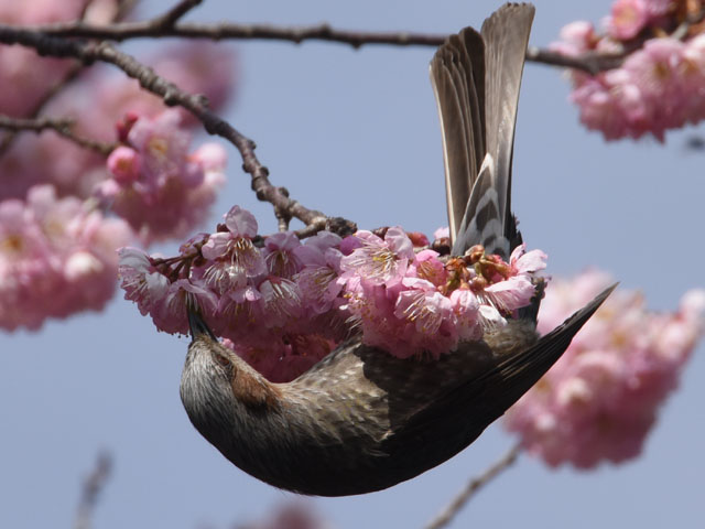 2015年3月17日、柏の葉公園を散歩した。公園でオオカンザクラの花が咲き誇っていた。ヒヨドリが桜の花の蜜を求めて集まっていた。早春になるとヒヨドリとメジロがこの花に集まる。大きいヒヨドリが小さいメジロを追い払うシーンをよく見かける。ヒヨドリにとって春は、餌の乏しい冬に耐えた後においしい蜜を食べられる快適な季節だ。ヒヨドリは嘴にたくさん桜の花粉をつけている。