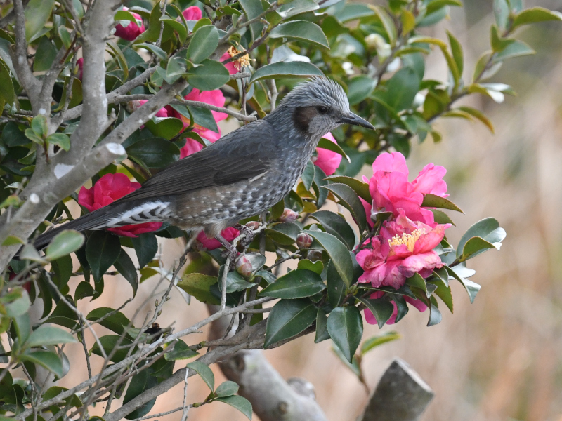 ヒヨドリは蜜が大好き, Brown-eared bulbuls love to eat the nectar of flowers.