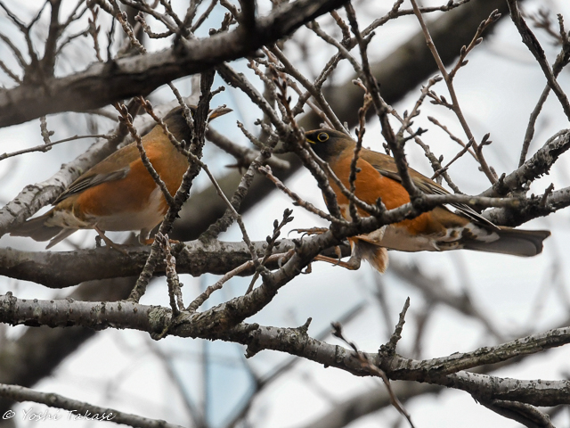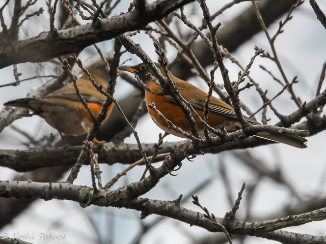 On cold day of February 2017, I saw two Brown-headed thrushes perching on branches of a tree in Mizumoto Park. I think this bird has a somewhat dark head and darker plumage so it may be a subspecies the Brown-headed thrush, Turdus chrysolaus orii.