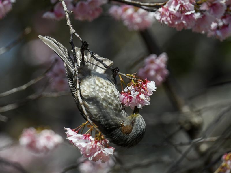 柏の葉公園にはいろいろな種類の桜が植えてある。この桜の花が咲くと毎年決まって沢山のヒヨドリが蜜を求めてやってくる(Mar. 4, 2024)。ヒヨドリのくちばしには桜の花粉が沢山ついている。メジロも来るがヒヨドリに追い出されてしまう。