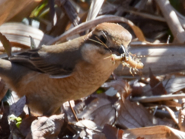 The prey caught by the shrike is like a house centipede because I can see a lot of long legs. Bull-headed shrike is carnivorous and eats insets and arthropods. On the other hand, House centipede is also carnivorous and preys on insects. It is a natural enemy of cockroaches and then is a beneficial worm for human. House centipede would self-cut legs when attacked by natural enemies such as birds, but the shrike seemed to have better skill than the house centipede.