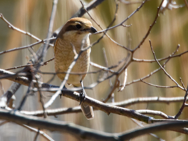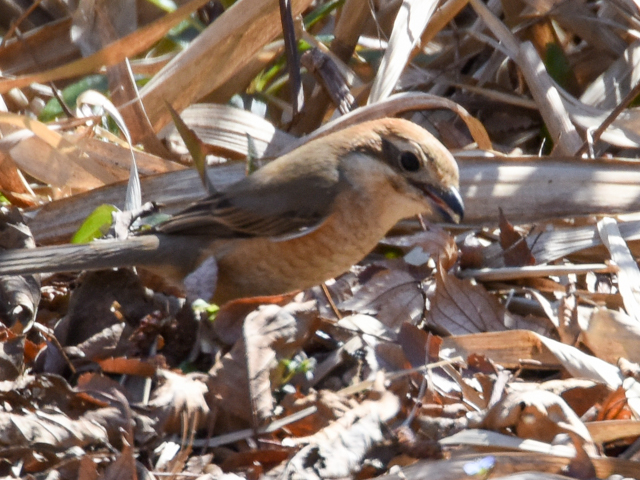 On March 3, 2017, I strolled in Mizumoto Park. A Bull-headed shrike has flew down on the bank of the “Kingfisher’s Pond”. It seems to have found a prey. After staring at the ground where fallen leaves were piled, the shrike picked up the prey immediately.