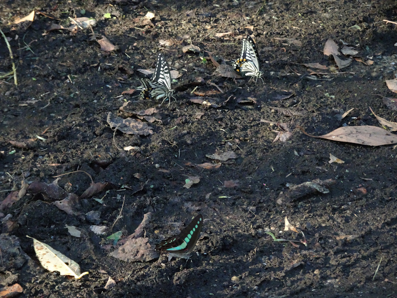 柏の葉第2水辺公園の遊歩道横の湿った地面でチョウが吸水していた。3頭もいる、アゲハ2頭とアオスジアゲハ1頭だ。特に若いオスのチョウが吸水することが知られているそうだ。ここの地面にはチョウが必要とするイオンを含んでいるのだろう。
