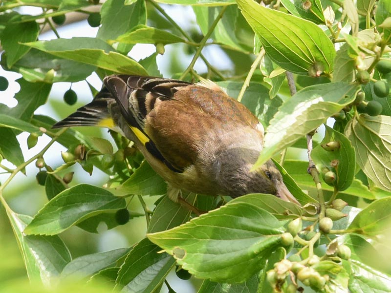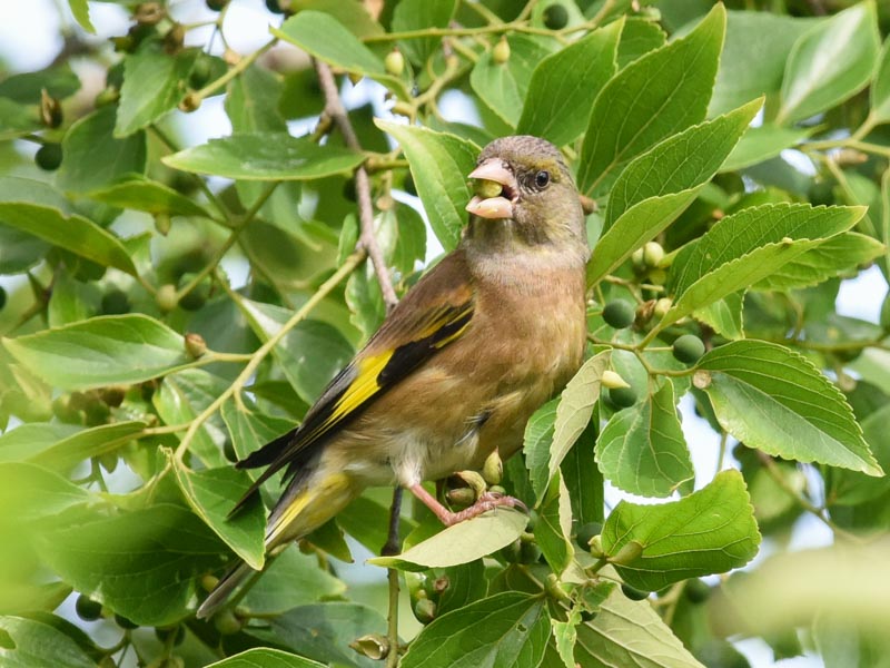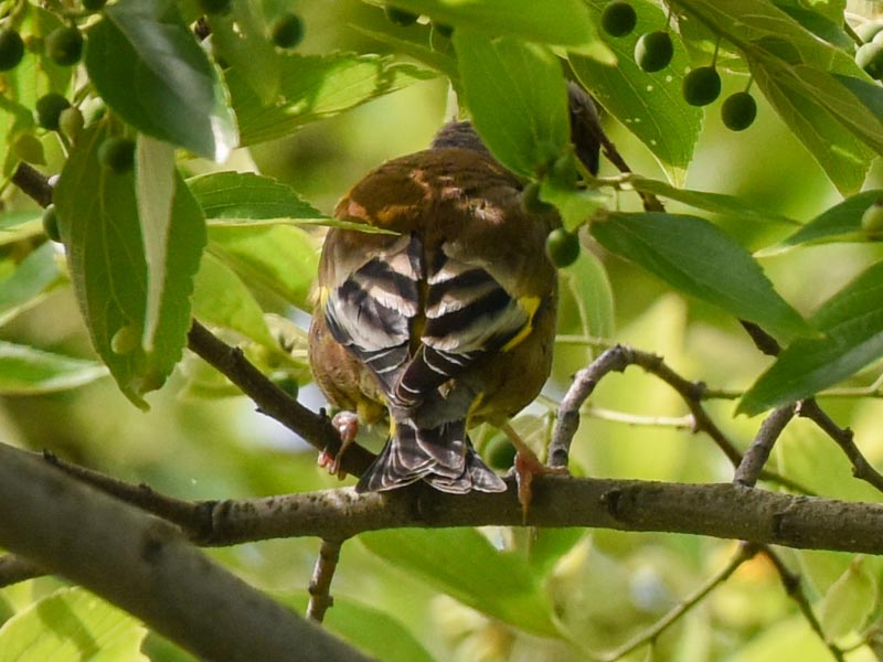 春に水元公園のエノキの実に集まったカワラヒワ, Oriental greenfinch group in Mizumoto Park on May 16, 2017