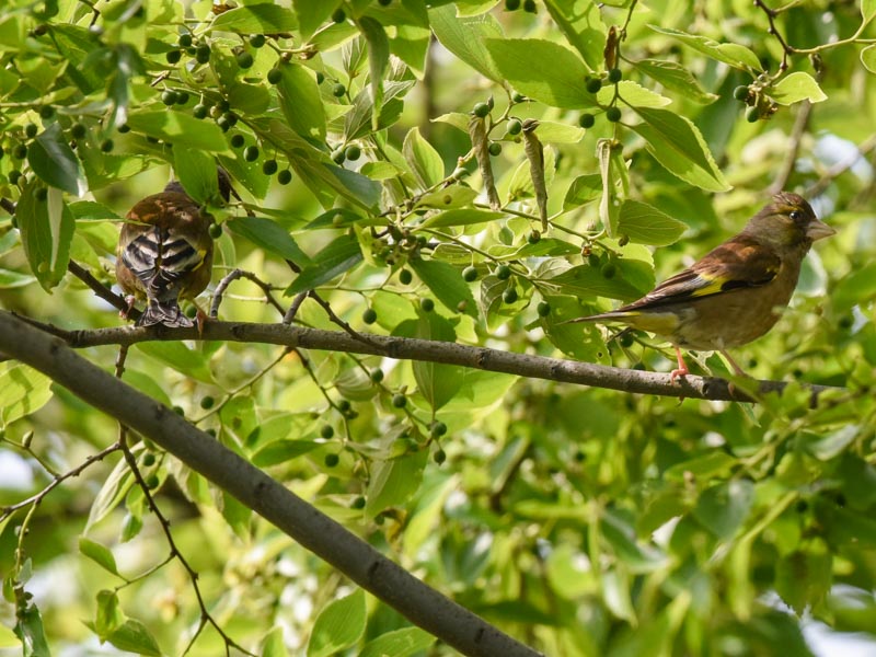 巣材を集めるカワラヒワのメスとオスのペア