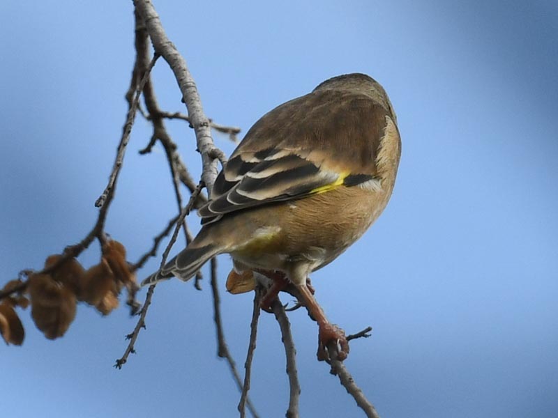 • カワラヒワのメスの体色は全体が黄褐色であり頭部から肩にかけて灰色がかる。