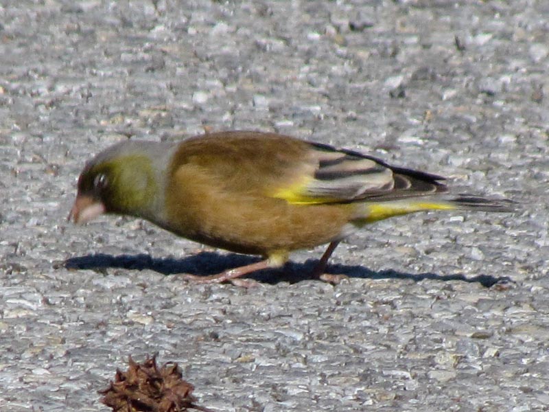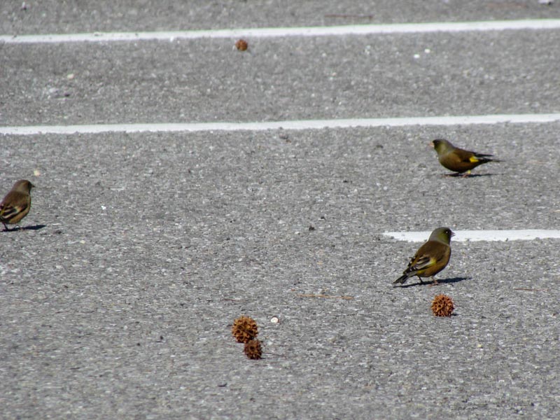 冬に柏の葉公園の駐車場に集まった3羽のカワラヒワ, Oriental greenfinch group in Kashiwanoha Park on Dec. 30, 2011