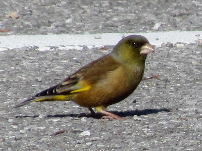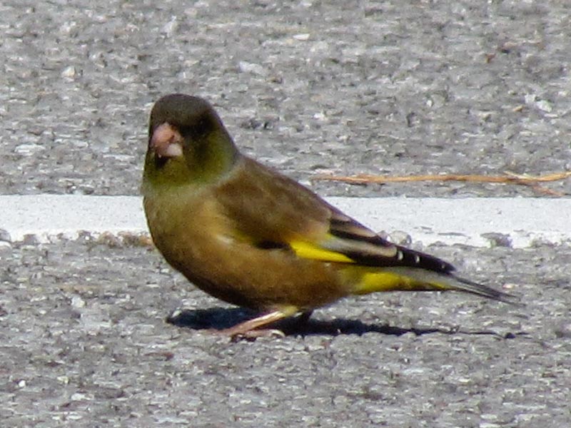 このカワラヒワはどちらだろうか?今回のカワラヒワを見た季節は春であり、三列風切の白い外周幅はNo. 1とNo. 2より広く目立つ、また、スズメよりやや大きく見えたのでオオカワラヒワ[3]または渡り性のカワラヒワ[4]ではなかろうか。