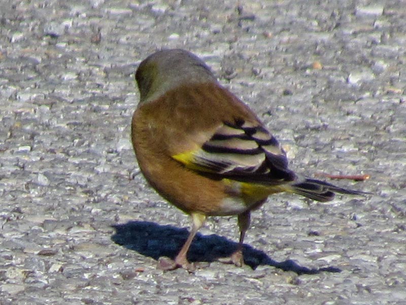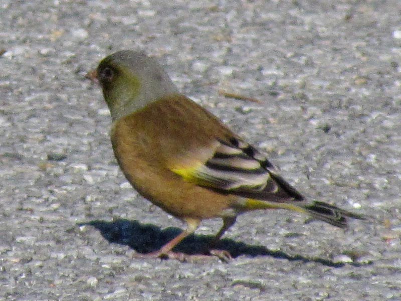 The entire body color is yellowish brown. The head and shoulders are slightly greenish-gray. It looked slightly larger than a sparrow.