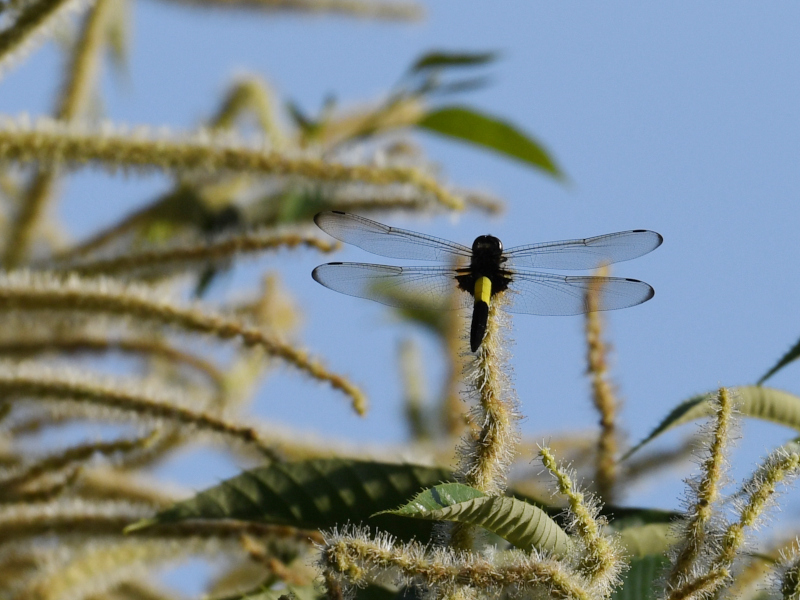 There are a few chestnut trees along the walkway of Konbukuro-Pond Nature Museum Park. They are blooming in summer. Looking closely, I also saw a dragonfly (Orthetrum triangulare melania) and a butterfly (Lethe sicelis).