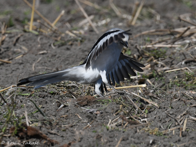 オオカラモズが地面に降りた。オオカラモズは地面に降りて虫を捕った。