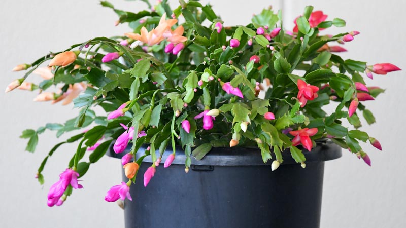 シャコバサボテンに蕾が付いた(Nov. 27, 2023)。1週間位経つとたくさんの花が咲いた(Dec. 2, 2023)。鮮やかな赤、ピンク、やや濁った黄色の花が付いている。白い蕾でも低温下で開花させると薄い桃色に花色が変わる性質があると書いてある。外の寒いベランダに置いてあったので桃色の花が多いのかもしれない。