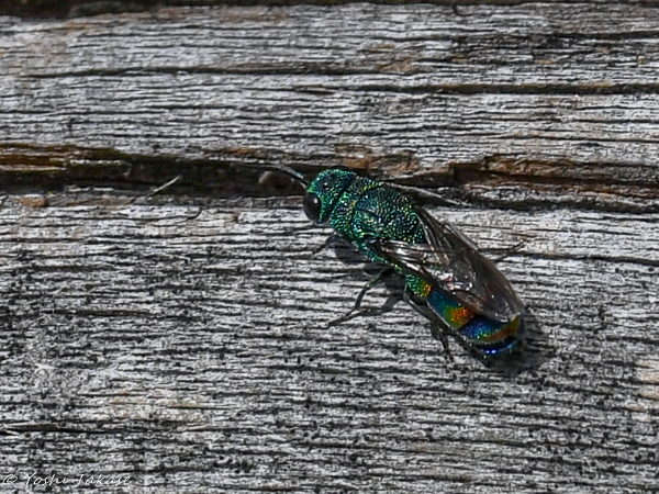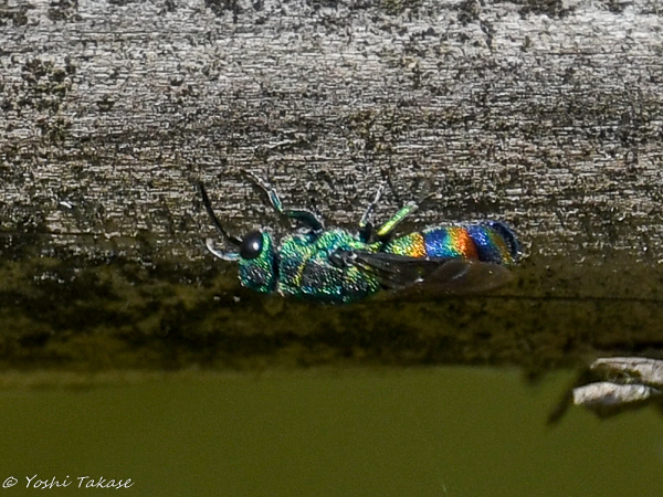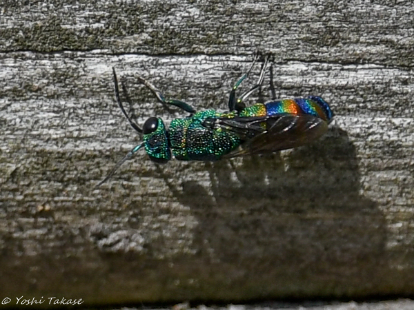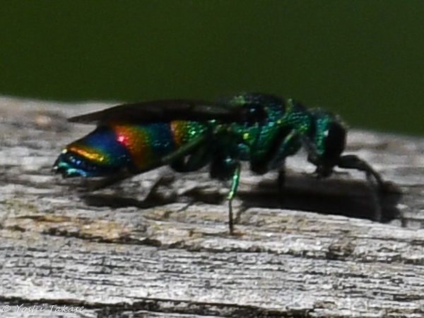 There is a reddish horizontal band on the abdomen, like a rainbow. When I searched on the Internet, I found pictures of Chrysis rubripyga and Chrysis fasciata, which are very similar. I was also able to take a picture of the tip of the bee’s abdomen. The tip of the abdomen is not reddish and three tooth-like protrusions are visible. The other side is invisible, but there are probably six such dentate protrusions. In that case, it would be Chrysis fasciata. It was explained that this bee parasitizes Discoelius japonicus. The reason for searching for cracks in trees may be to search for the nest of the host wasp.