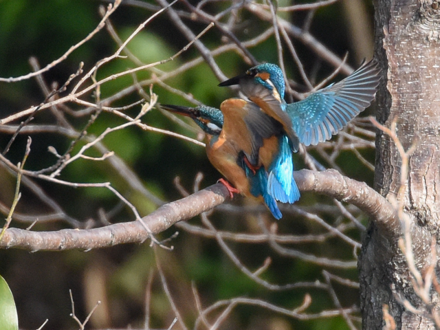 オスのカワセミは大きく翼を広げた。オスはメスから離れて飛び去った。交尾は成立しなかったように見える。