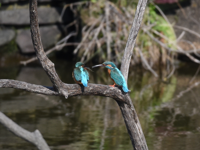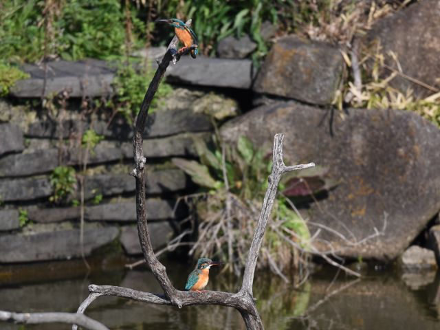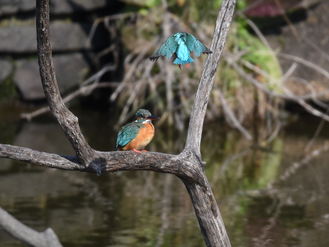 メスのカワセミが池の止まり木に現れた。すぐにオスが餌を持って飛んできた。