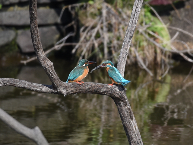 オスのカワセミはメスの前に近づいた。オスのカワセミはメスの前に止まり、嘴にくわえた魚を差し出している。