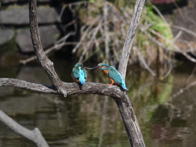 メスのカワセミは、すぐには魚を受け取らなかったが、やがて受け取った。オスのカワセミはメスが魚を飲み込むまで直立不動の姿勢をしていた。オスは緊張しているのだろうか?