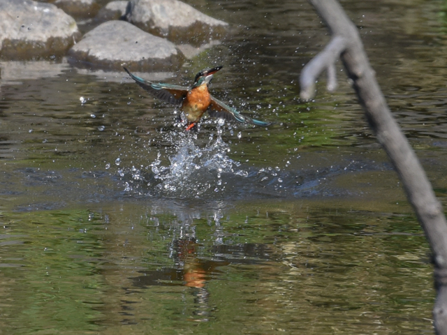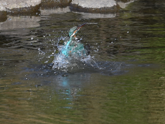 魚を食べ終わったメスのカワセミは3,4回水に飛び込んだ。餌を捕るためではないようだ。カワセミは止まり木の近くで水に飛び込んだので、比較的よく自動焦点が合った。