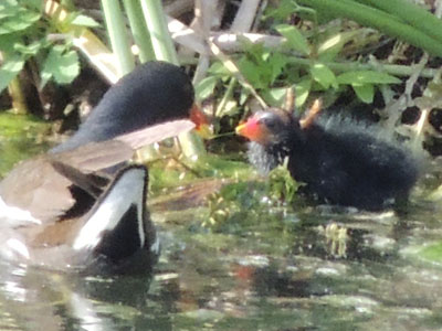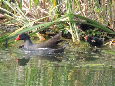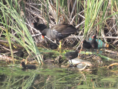 バンは葦に覆われた岸に近づいた、雛がいる、黒い毛玉が4羽写っている、この写真で初めて気付いた、肉眼では分かりませんでした。昨年は1羽の雛を見た(2011/6/13)、それに続き今年も雛がかえったんだ、しかも4羽も。