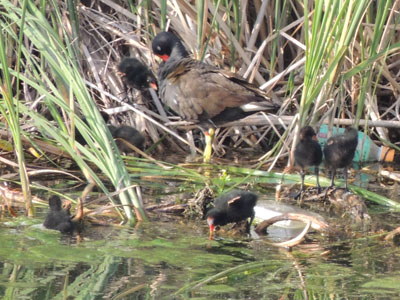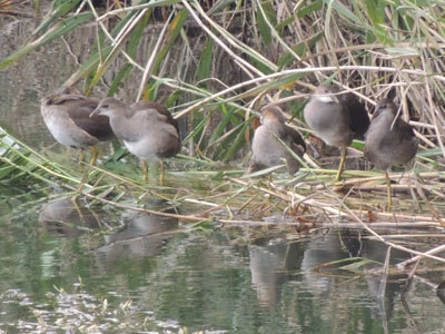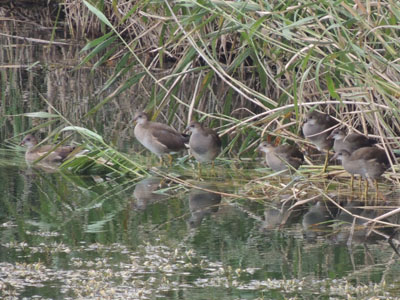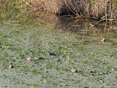 この日には葦原の対岸あたりに親子がいる、子は6羽見える。ズームインしてみる、子もずいぶん大きくなった、背の羽毛も全員茶色になった。