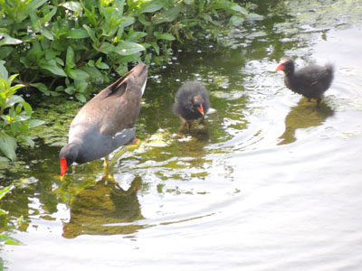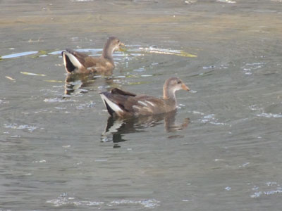 On this day I saw three common moorhens, one in the water and two feeding on the ground.
