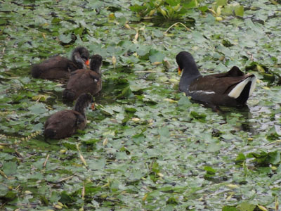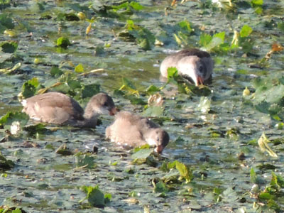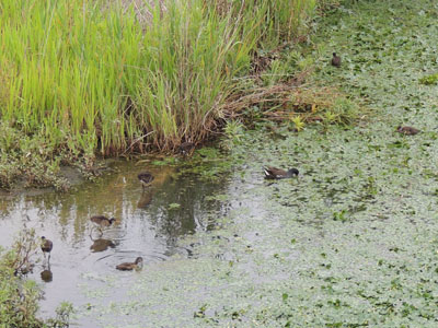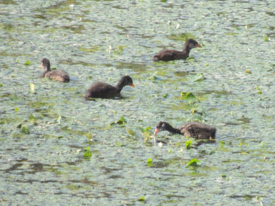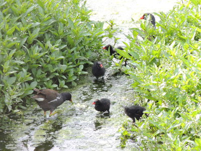 ごま団子ようだった雛も成長して茶色の羽毛が体を覆っている、早いもんだ。茶色っぽい羽毛の子バン達、雛全員育ったのかな。いつもの所に親がいる、この奥に営巣しているんだろう。