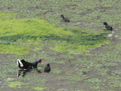 最近ここで見かける1羽はお母さんバンだったのか、雛がかえったのは2, 3日以内じゃないかな。離れようとすると雛がンマーと鳴いている、雛にやるためせっせと新鮮なアオミドロを採っているようです。